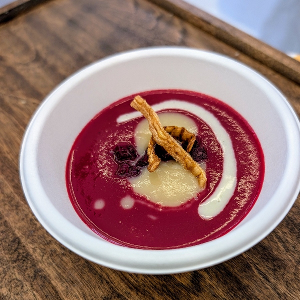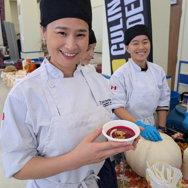 A team of seven Culinary students and three faculty chefs represented Humber Polytechnic, hosting one of fifteen chef-led soup stations that served more than 250 guests. The Humber team showcased their creativity and technical expertise with a vegan roasted beet and parsnip soup duo, topped with tangy pickled beets, crispy parsnip chips, and a swirl of garlic coconut cream, a dish that perfectly balanced sweet, savory, and creamy flavors.