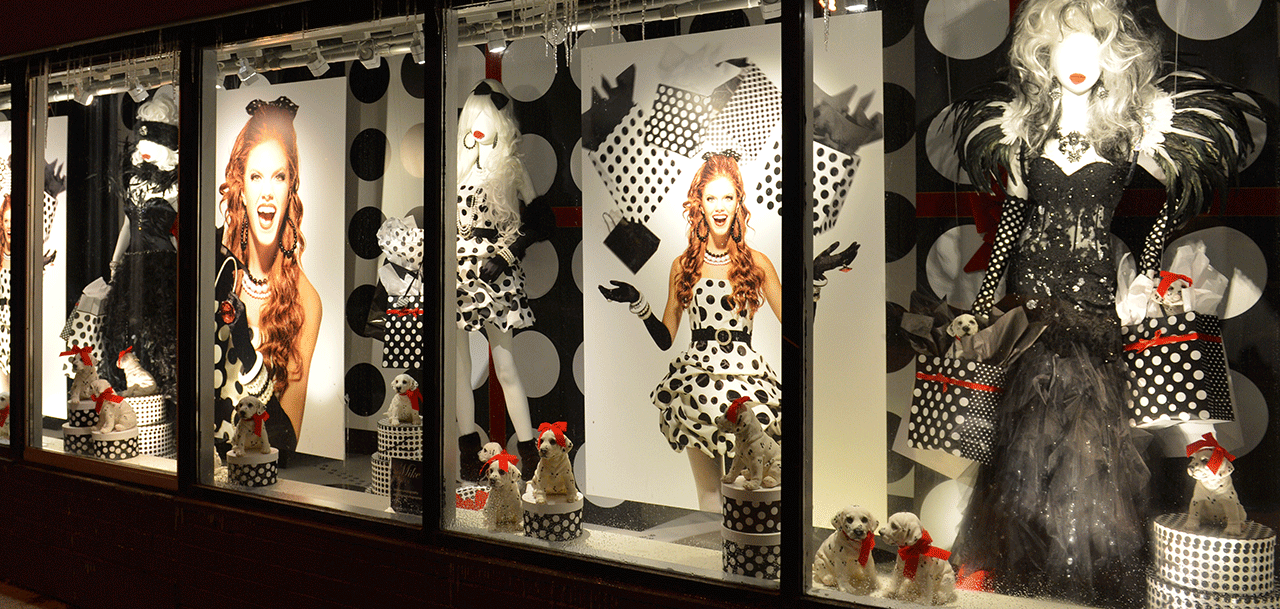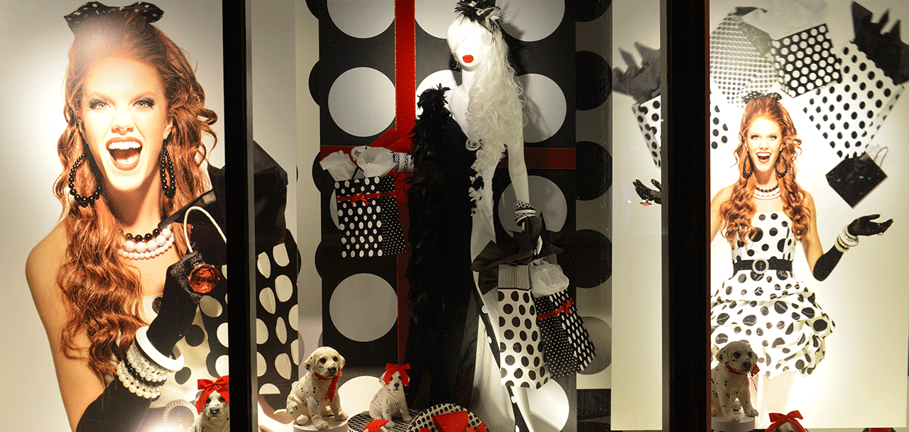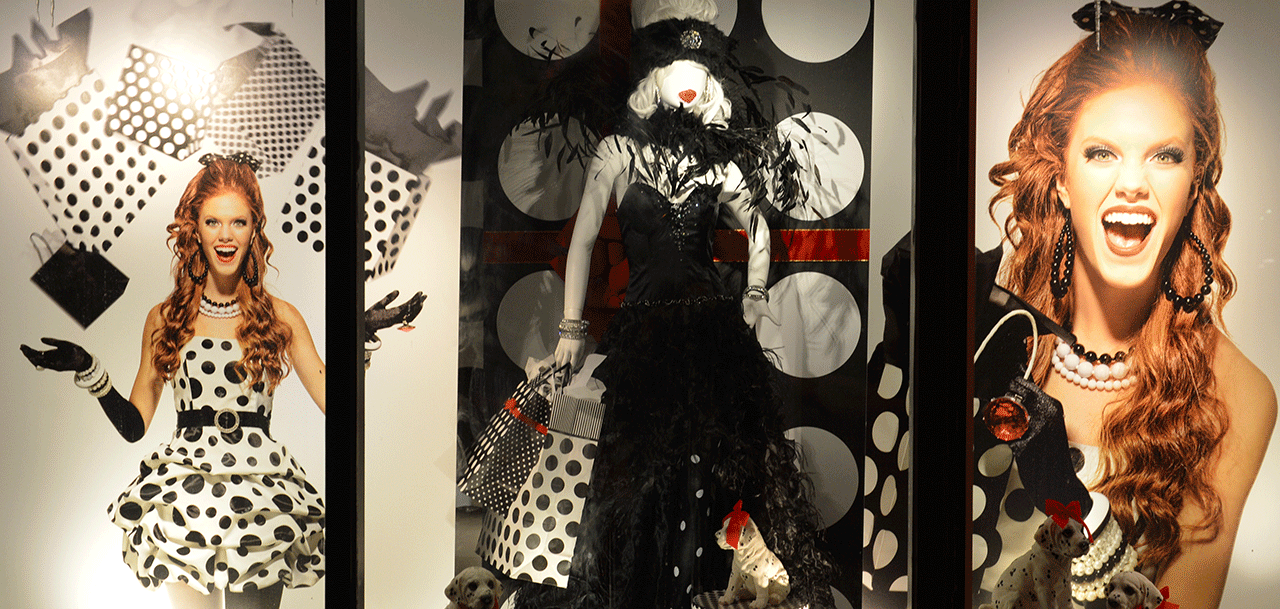 This fun filled high contrast holiday window display captures your attention by utilizing an assortment of polka dot props including: hat boxes, shopping bags, large scale gift wrap and thirty-five adorable dalmatian puppies.