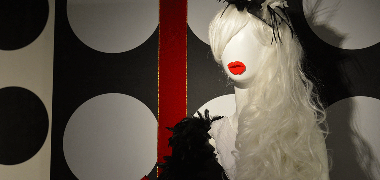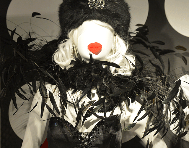 The lead mannequin pays tribute to Cruella De Vil and her iconic over the top signature high contrast style, complete with high volume wig and glorious black and white feather shrug.