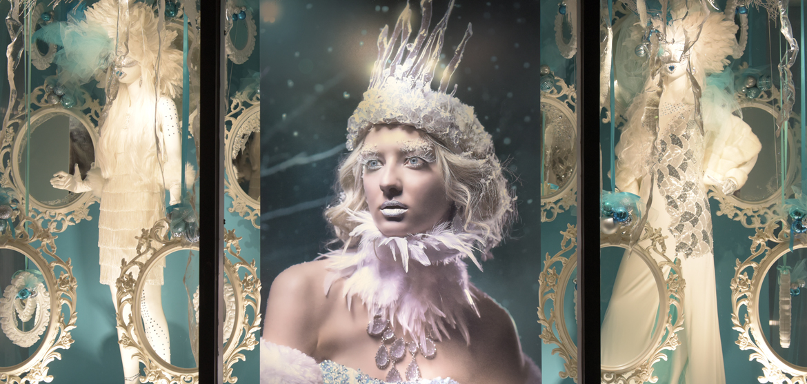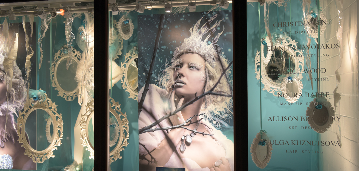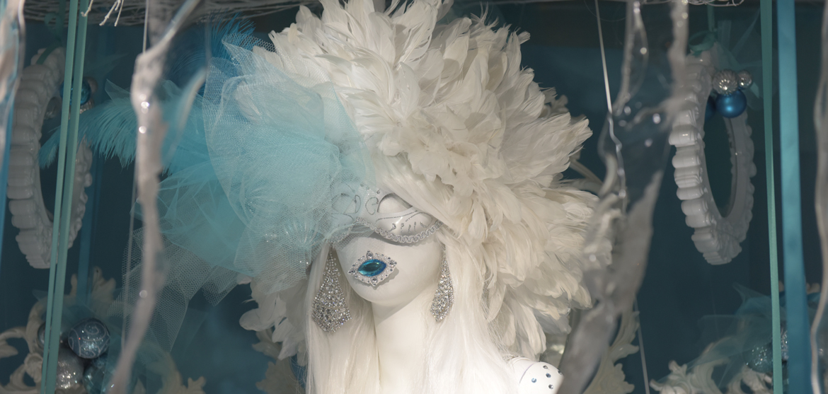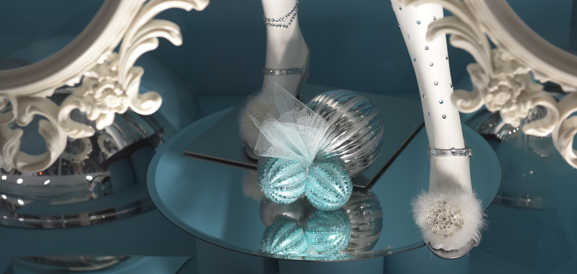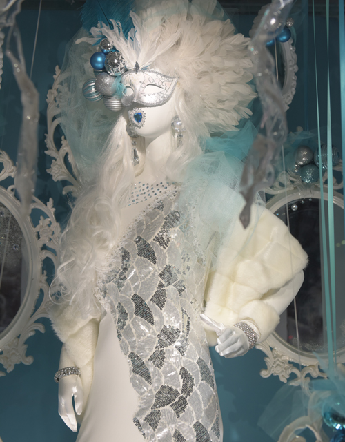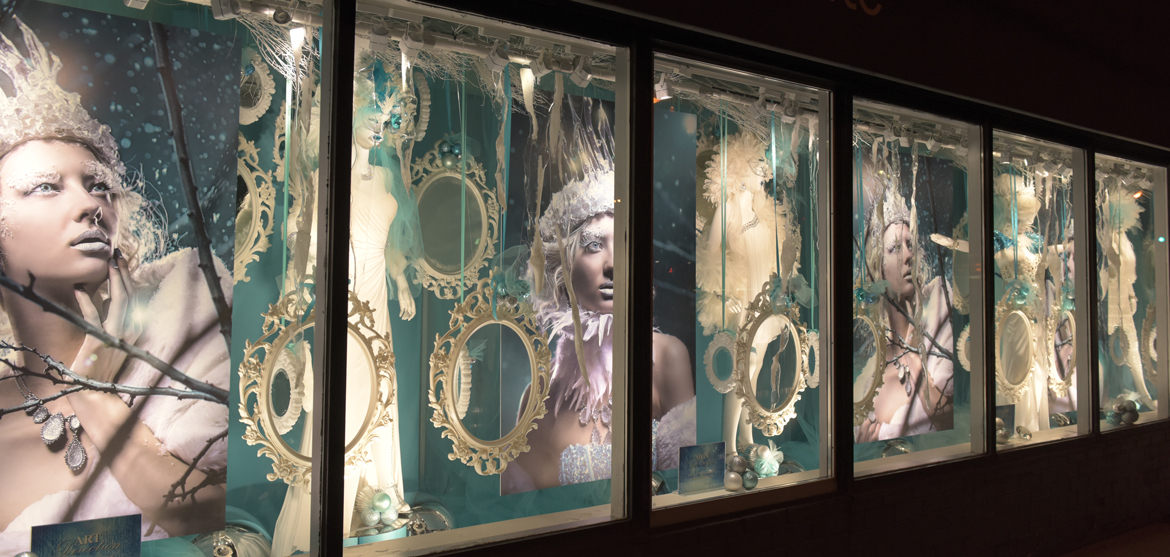 A trendy tiffany blue colour story kept things simple while highlighting pristine white gowns adorned with hundreds of crystals. Enormous icicles made from melted plastic were suspended along the front of the display creating visual interest and adding depth to the presentation. White feathered wigs introduced a fantasy element to this display while hundreds of feet of tiffany blue tulle framed the entire space, creating a sense of whimsy and adding a feminine touch.