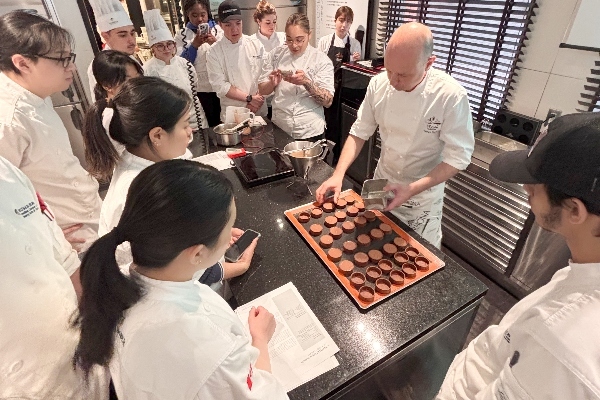 The program continued in Taipei, where additional pastry workshops further developed students’ technical skills. From there, the group travelled to Tokyo, Japan, where they examined retail grocery trends and advanced their expertise through specialized training at the Valrhona Chocolate Academy with Maître Pastry Chef Fabrice David. Market explorations revealed Japan’s dynamic culinary supply chain, while hands-on workshops in sushi-making, ramen preparation, and Japanese tea ceremonies underscored the importance of cultural context in culinary practice. Student-led walking tours complemented these activities, fostering leadership, teamwork, and applied learning in real-world environments.